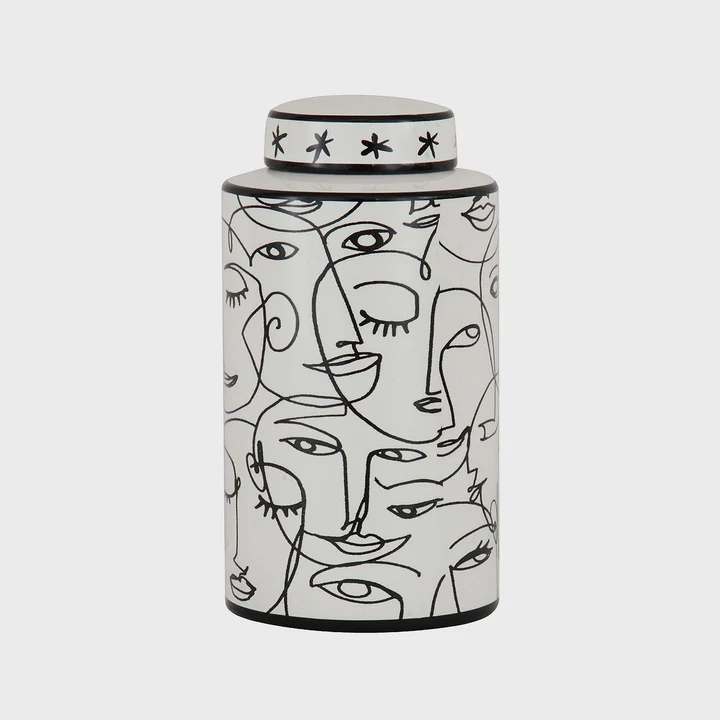 Embrace the beauty of simplicity with the Face Lidded Jar in White & Black. Its clean lines and minimalist design make it the perfect accent piece to any room.