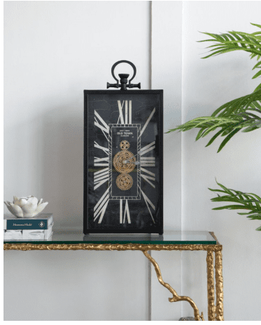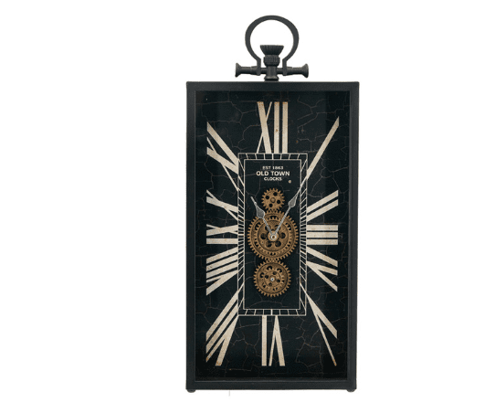 Elegant and vintage-inspired, this black rectangular clock features exposed gears and Roman numerals, adding a touch of industrial charm to any room.”