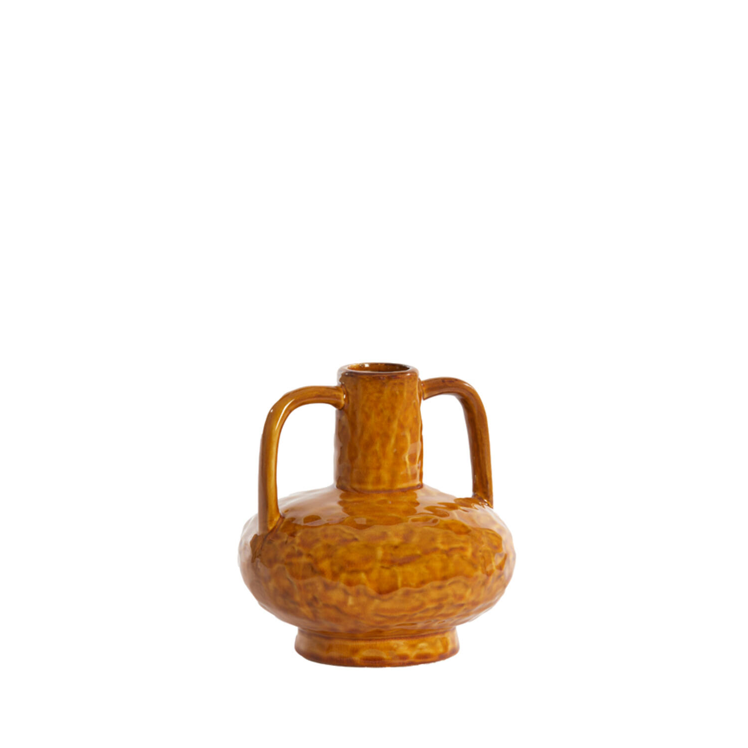 Brighten up any space with this shiny ocher yellow ceramic vase. Its vibrant hue and sleek design make it perfect for small floral arrangements or as a bold décor accent.